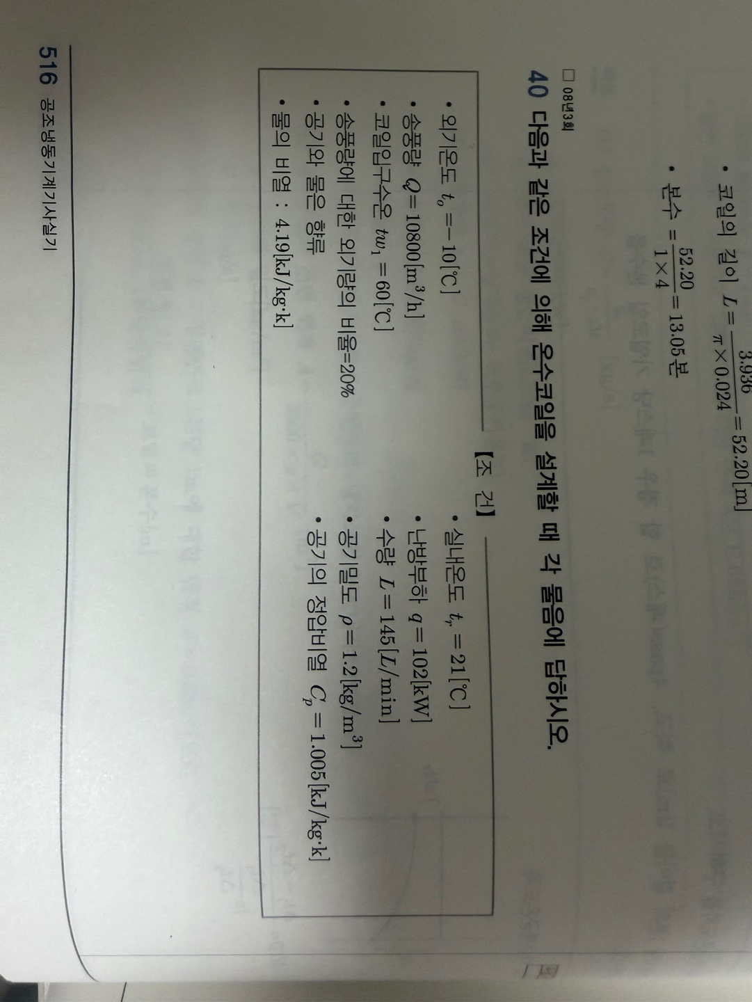 상기 제목과 같이 난방부하 40번문제 516p 중 주어진 난방 부하는 102kW인데, 40번 중 6번 문제 열평형식 10800*1.2*1.005*(49.19-14.8)/3600 적용 시 124kW가 도출 되어
